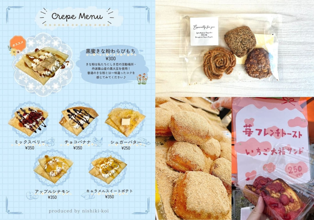 私はイベント企画が好きです。大学時代に所属していた農業ボランティアサークルでは、活動地域である丹波篠山市の名産を使ったお菓子を作るプロジェクトを立ち上げました。この写真はプロジェクトで作ったきな粉や苺のお菓子たちです。デザインすることも好きで、クレープメニューも自分で作りました。こだわりをたくさん詰め込んで、ゼロから何かをつくり上げることにワクワクします。