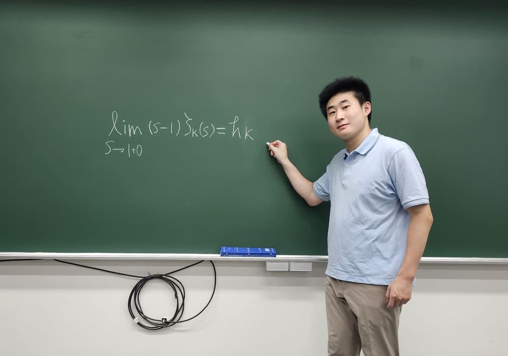 私は大学院で数学を専攻しています。そこで、大学院で学んできて印象に残っている、類数公式というものを黒板に書きました。右辺のhは類数と呼ばれるもので、この類数を計算することができる公式です。数学には3大分野と呼ばれる代数・解析・幾何という3つの分野があり、類数は代数の分野のものです。しかし左辺は解析的な関数で、この類数公式は異なる2つの分野の代数と解析を結びつける式であることがおもしろいです。またこの類数公式は幾何の分野で証明することもでき、3大分野すべてに関係している点もおもしろいです。