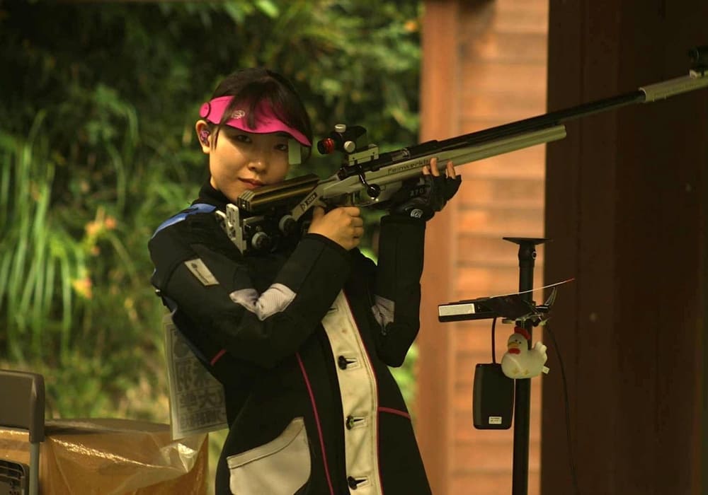 体育会射撃部の大会での様子です。写真は立射という姿勢で、50m先の的を狙っています。競技時間は90分で、3姿勢合計60発の精密度合いを競います。火薬の弾を使用しているのですが、1発なんと35円〜80円くらいします・・・。撮られているのに気づいて、カメラ目線な1枚です(笑)!